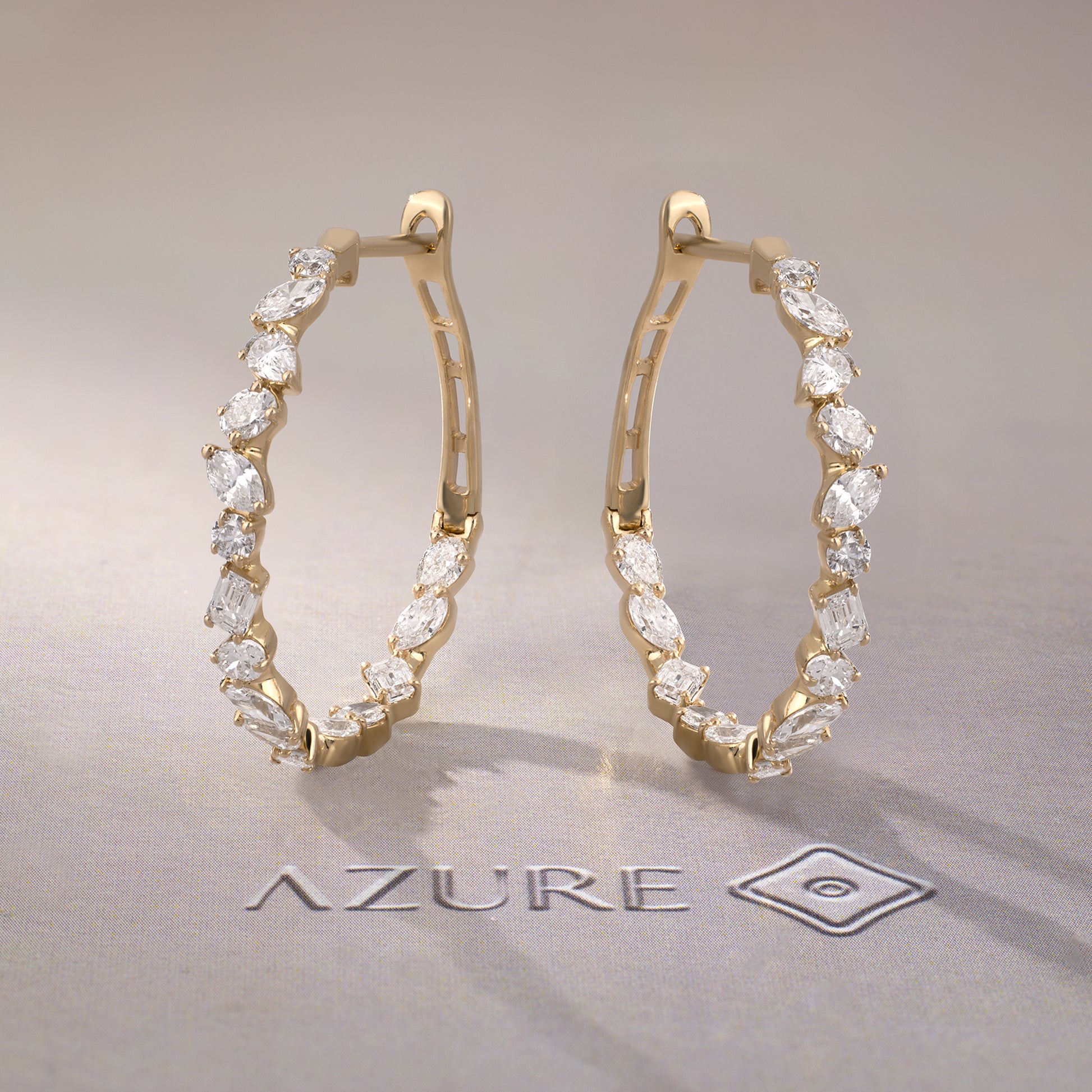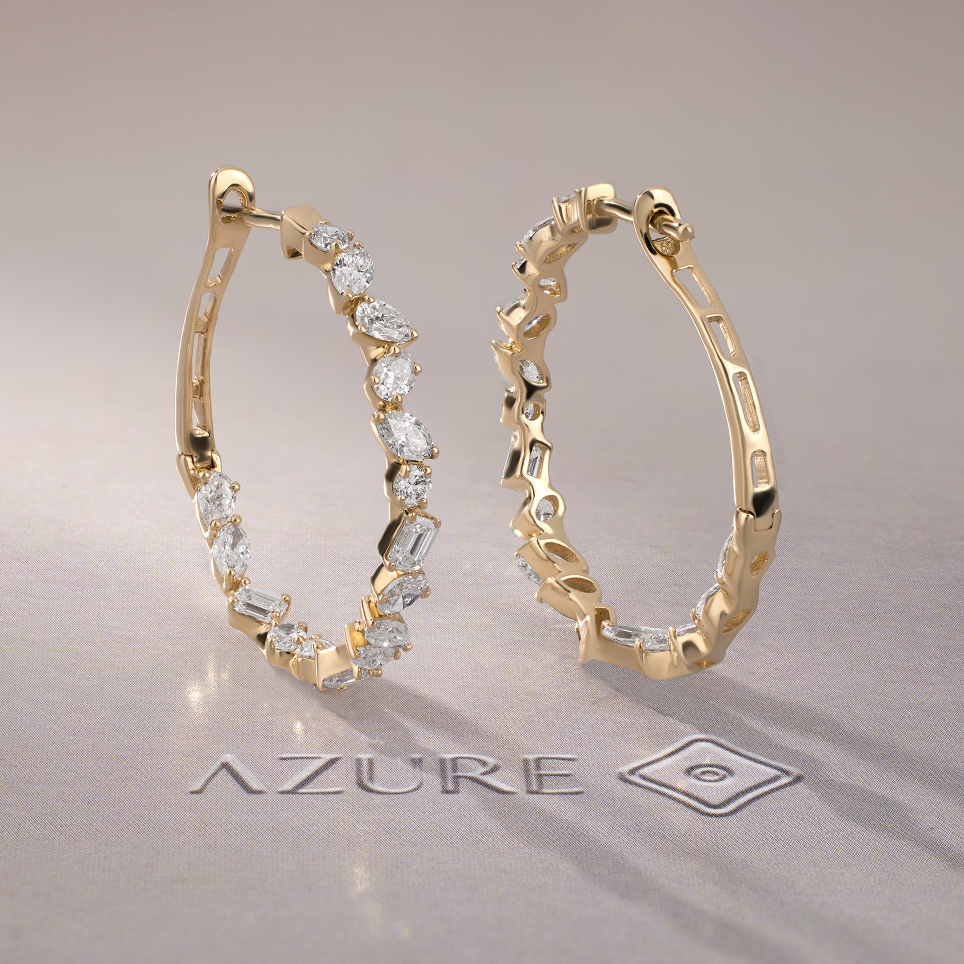 Crafted in 14k yellow gold, these elegant hoop earrings showcase a stunning medley of marquise, round, pear, Emerald and oval diamonds that work in concert to create captivating dimension. The refined setting allows each facet to catch and reflect light with exceptional clarity, delivering a sophisticated glow that complements any occasion. Designed for effortless everyday elegance, these hoops balance contemporary design with classical sensibility, making them an essential addition to any discerning jewelry collection.