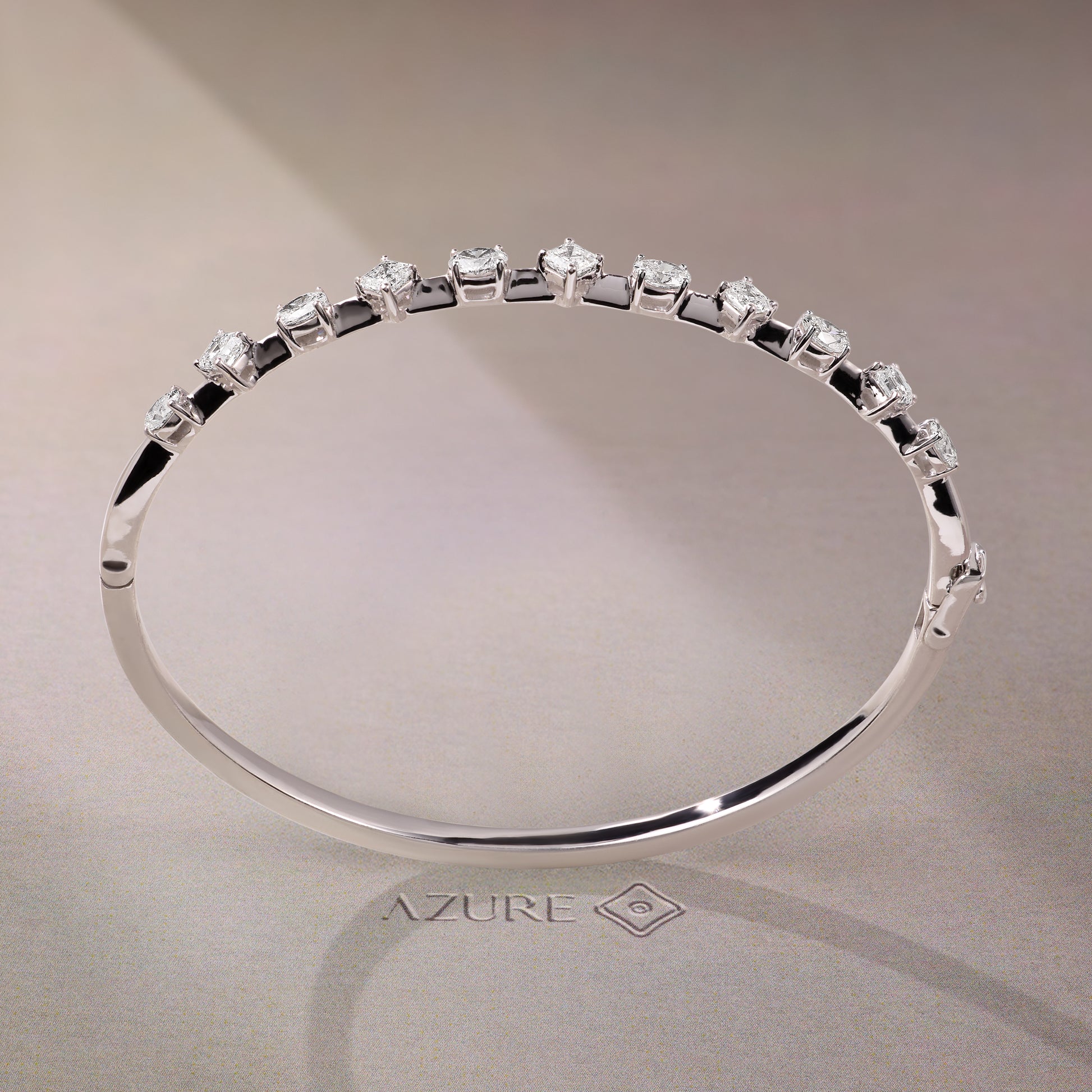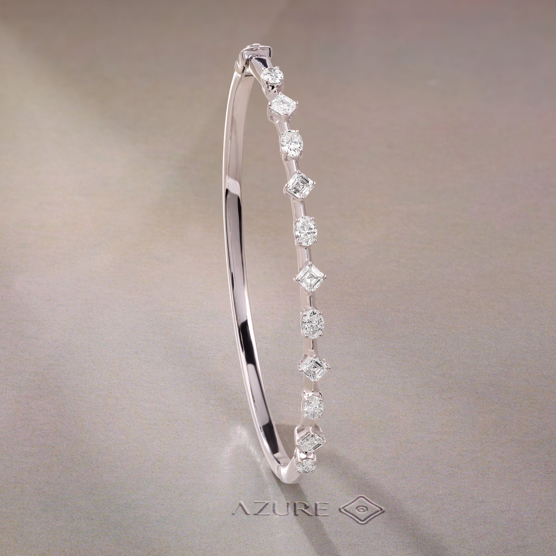 This elegant 14K white gold bangle blends minimalist design with a subtle sparkle, perfect for daily wear. Featuring a refined combination of Oval and Asscher-shaped stones, it offers a clean shine that complements any stack. Ideal for those who appreciate understated sophistication and versatile style.