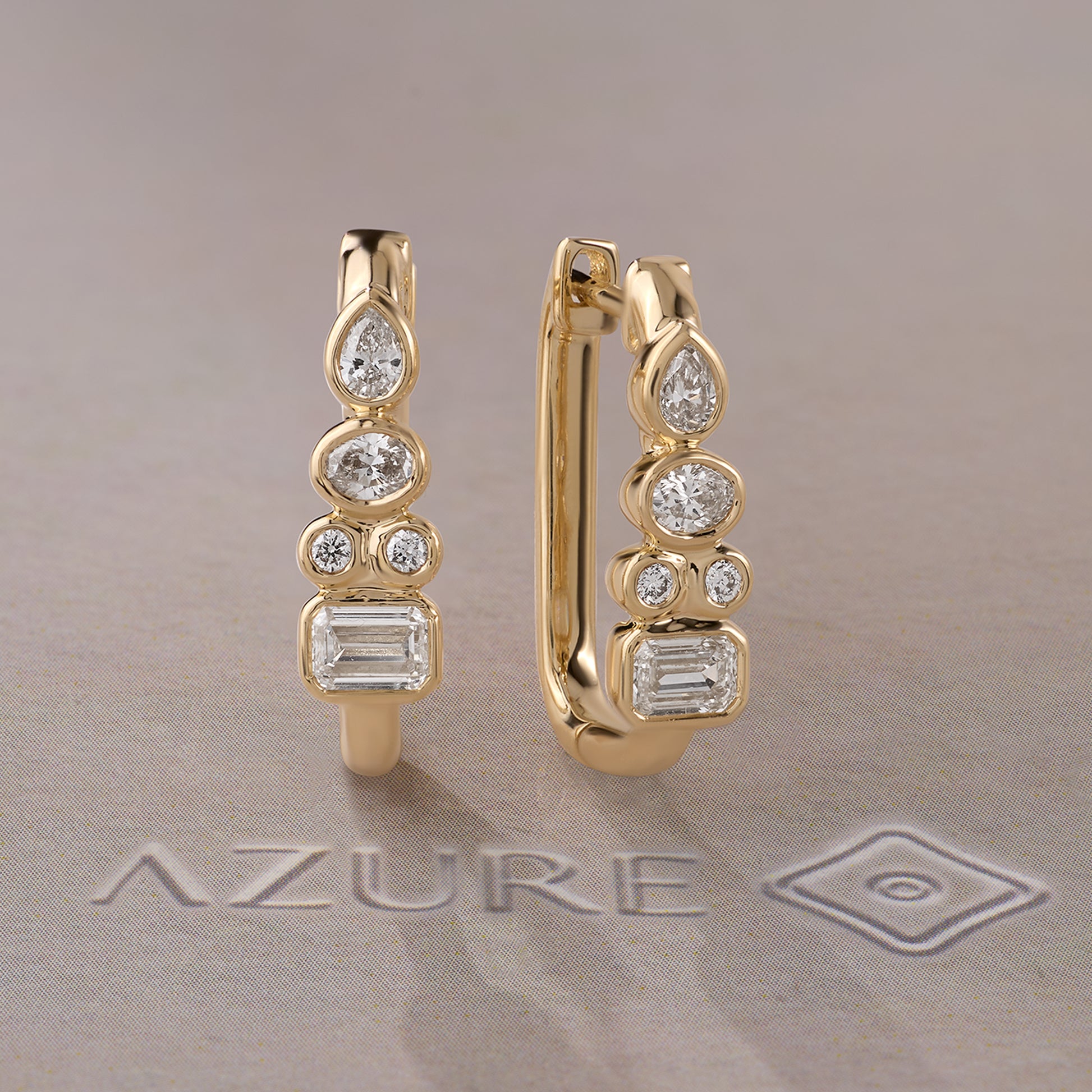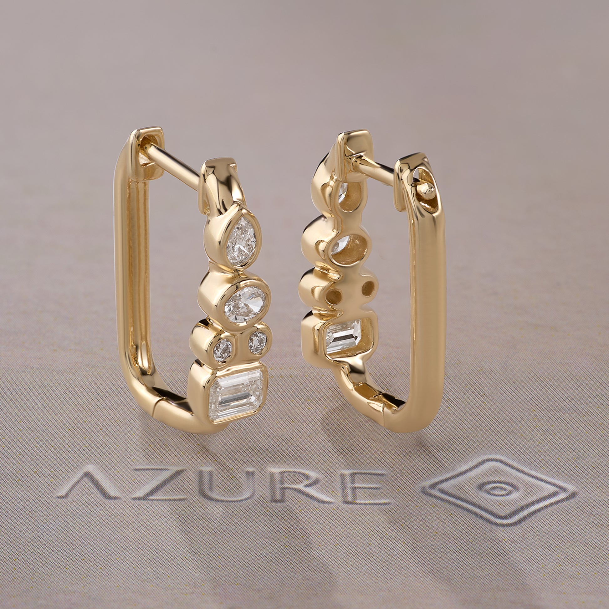 Elevate your everyday elegance with these exquisite 14K yellow gold earrings, featuring a captivating blend of oval, pear, and round diamonds complemented by a striking emerald-cut diamond accent. The multi-shape diamond hoop design seamlessly transitions from morning meetings to evening occasions, delivering sophisticated sparkle throughout your day. Crafted as refined statement pieces, these earrings embody timeless luxury while maintaining the versatility of essential jewelry.