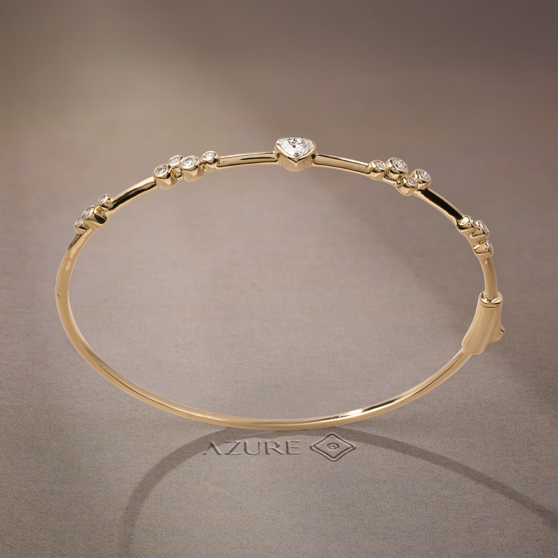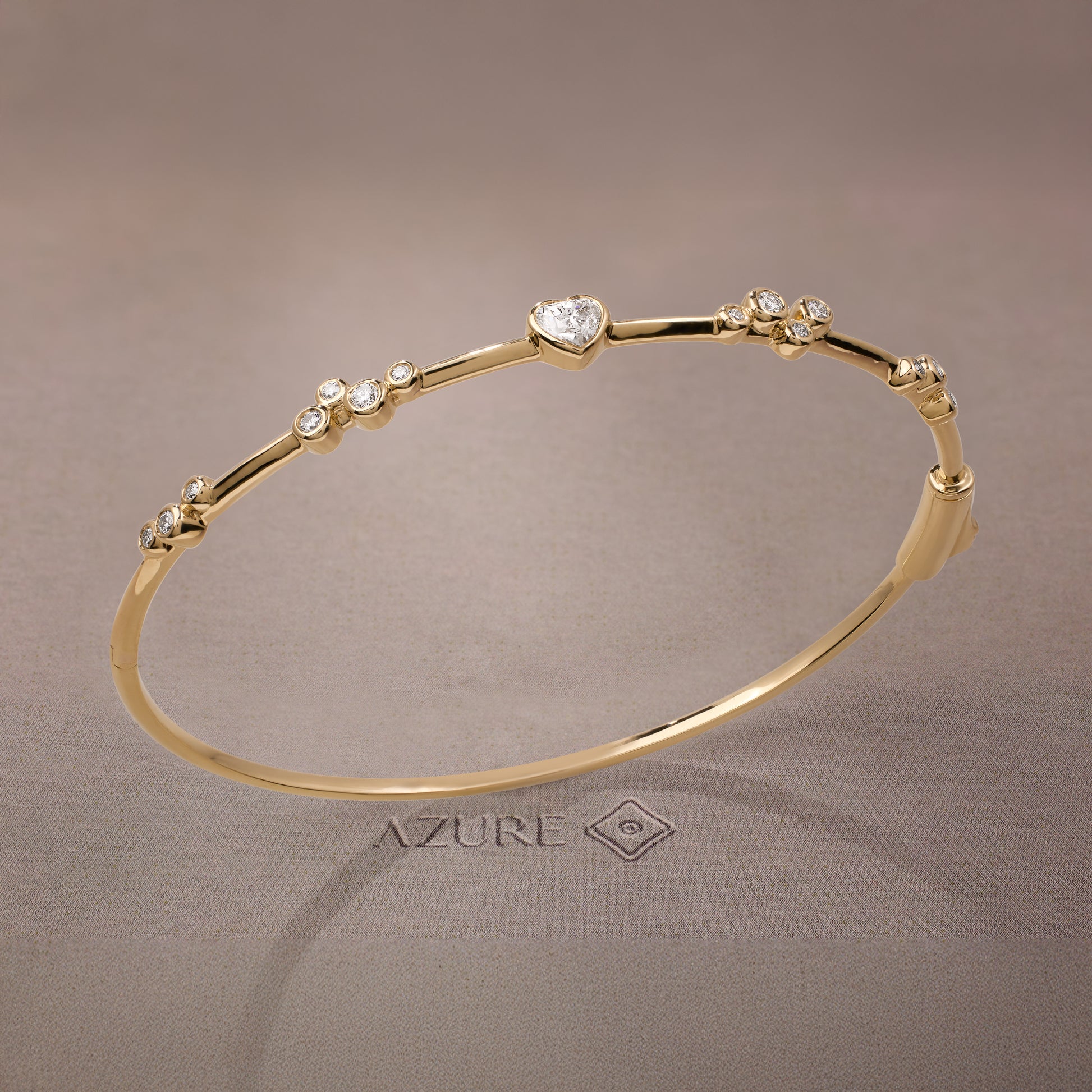 This elegant 14k yellow gold bangle features a timeless design perfect for transitioning from work to weekend with ease. Its classic silhouette is enhanced by a heart-shaped center stone flanked by round side stones, offering a soft, radiant glow. Designed to be stackable, it complements any jewelry collection while adding a subtle, sophisticated touch to your everyday style.