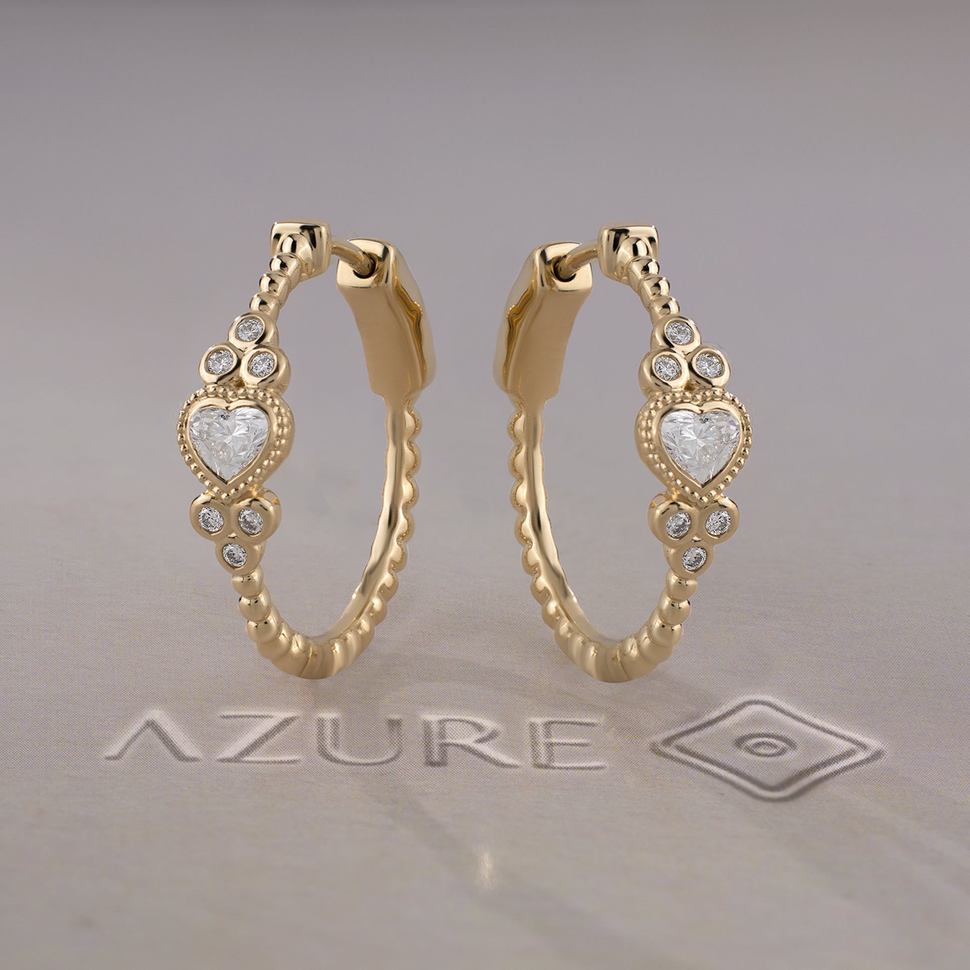 Discover the allure of these handcrafted 14K yellow gold earrings, where an elegant Heart centerpiece is gracefully framed by Round accent stones. The intricate beaded hoop design creates a luminous interplay of light and shadow, embodying the pinnacle of fine jewelry craftsmanship. A sophisticated choice for those who value timeless beauty and meticulous artisanal detail.