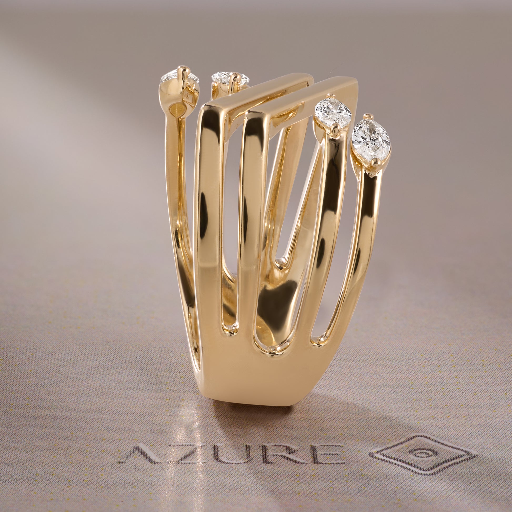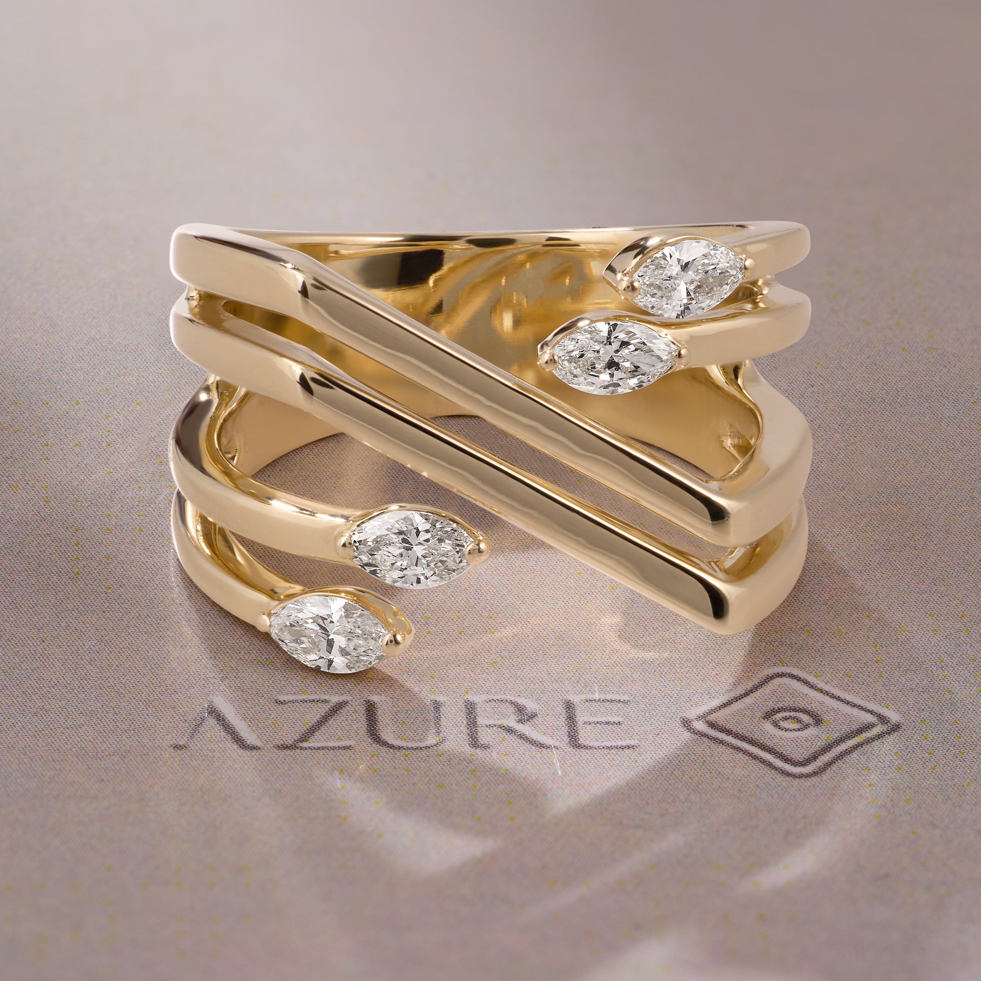 Elevate your everyday elegance with this striking 14K yellow gold ring, featuring a captivating marquise diamond. The innovative crossover band and multi-layer design create a modern statement piece that balances bold confidence with refined sophistication. Luminous sparkle catches the light from every angle, making this the perfect accessory for those who appreciate understated luxury without compromise. A contemporary masterpiece that transcends occasion.