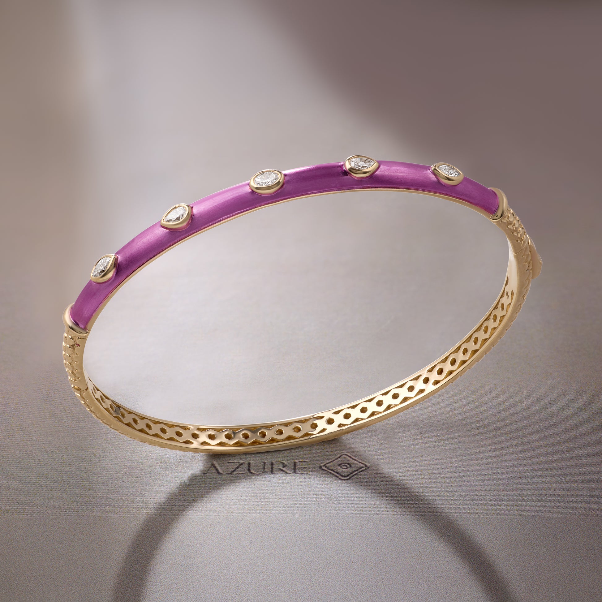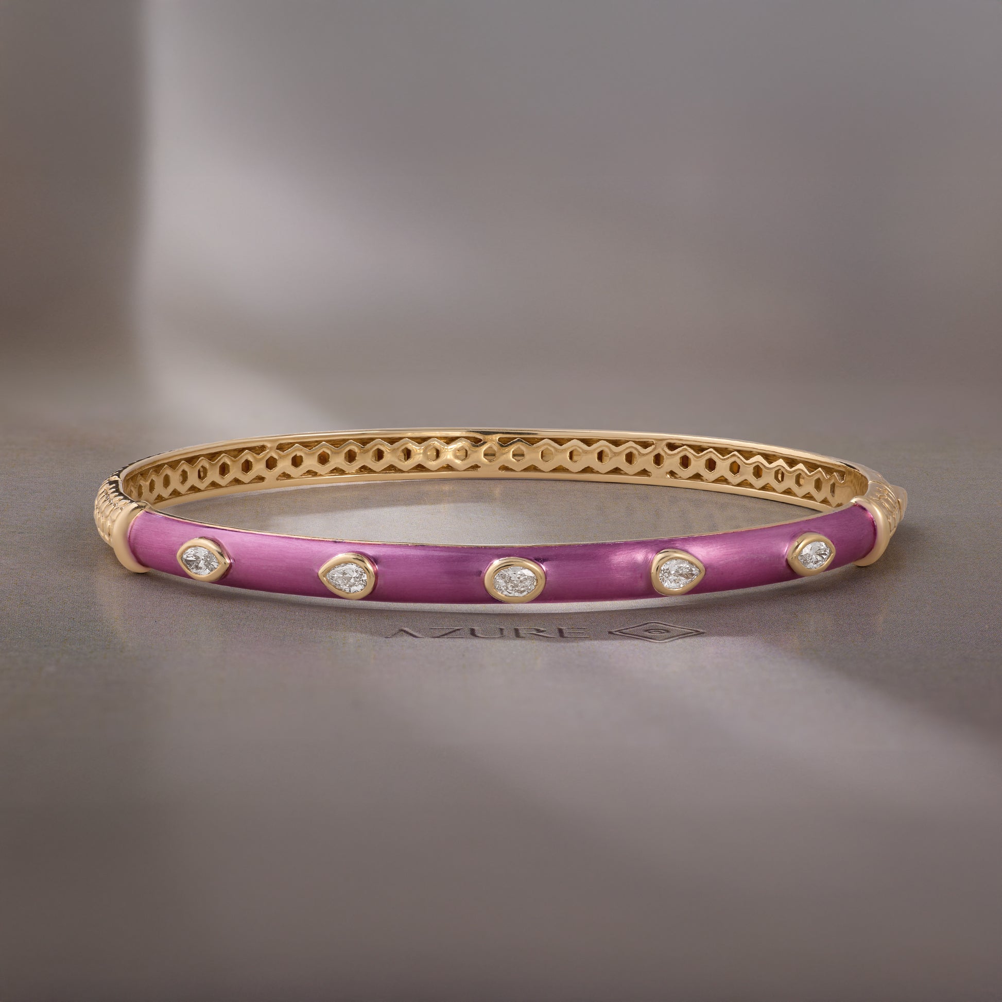 This exquisite 14k yellow gold bangle blends Marquise, Oval, and Pear-shaped stones with delicate pink enamel accents, creating a refined glow that elevates your style. Its classic yet chic design transitions effortlessly from day to night, adding a sophisticated touch to any ensemble. Perfect for those who appreciate understated elegance with a modern twist.