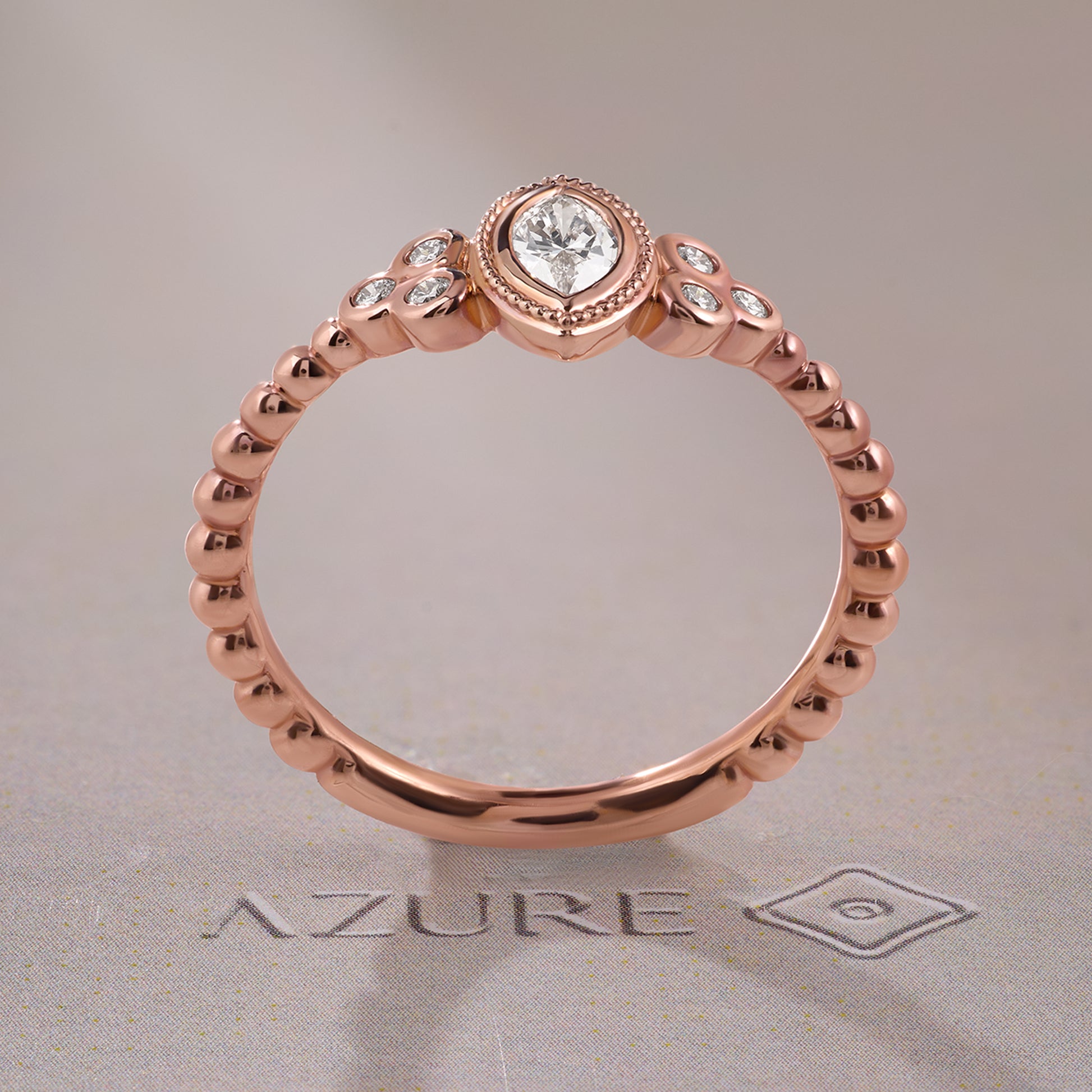 Timeless sophistication meets refined craftsmanship in this exquisite 14K Pink gold ring. The graceful marquise-cut diamond takes center stage, flanked by brilliant round side stones that amplify its radiance. Delicate milgrain beading adorns the band, adding vintage-inspired detail and textural depth. A masterpiece of feminine elegance, this classic design transcends trends, making it the perfect choice for engagements, anniversaries, or as a cherished heirloom piece.