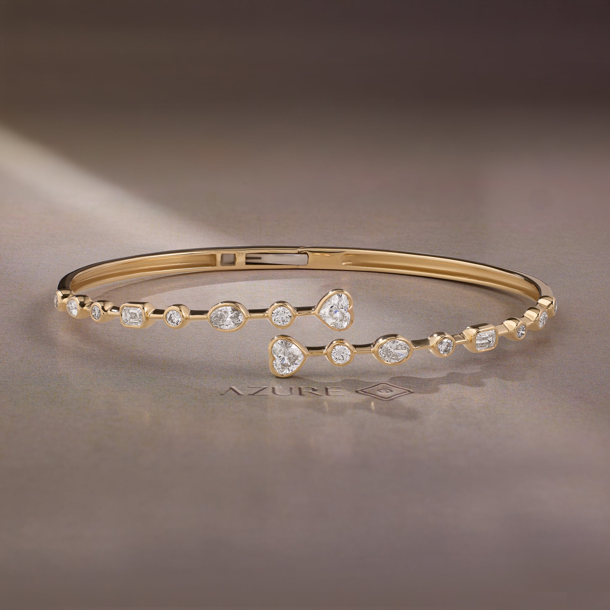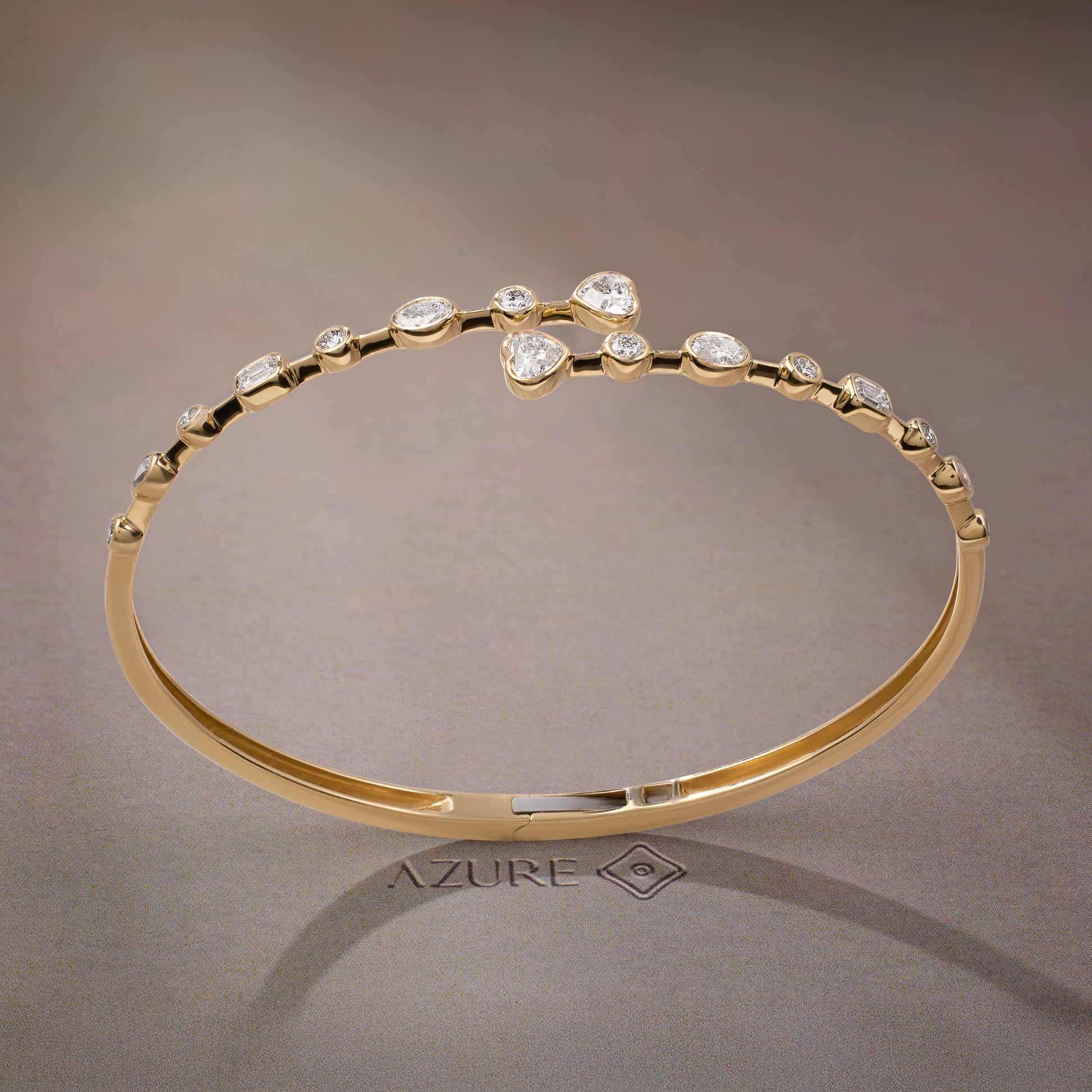 Crafted in 14K yellow gold, this understated bangle brings everyday luxury to your wrist. Its elegant mix of Pear, Round, Emerald, Heart, and Oval shapes makes it perfect for all-day wear and stacking with your favorite pieces. Designed for those who appreciate subtle sophistication, it seamlessly complements any look with timeless charm.