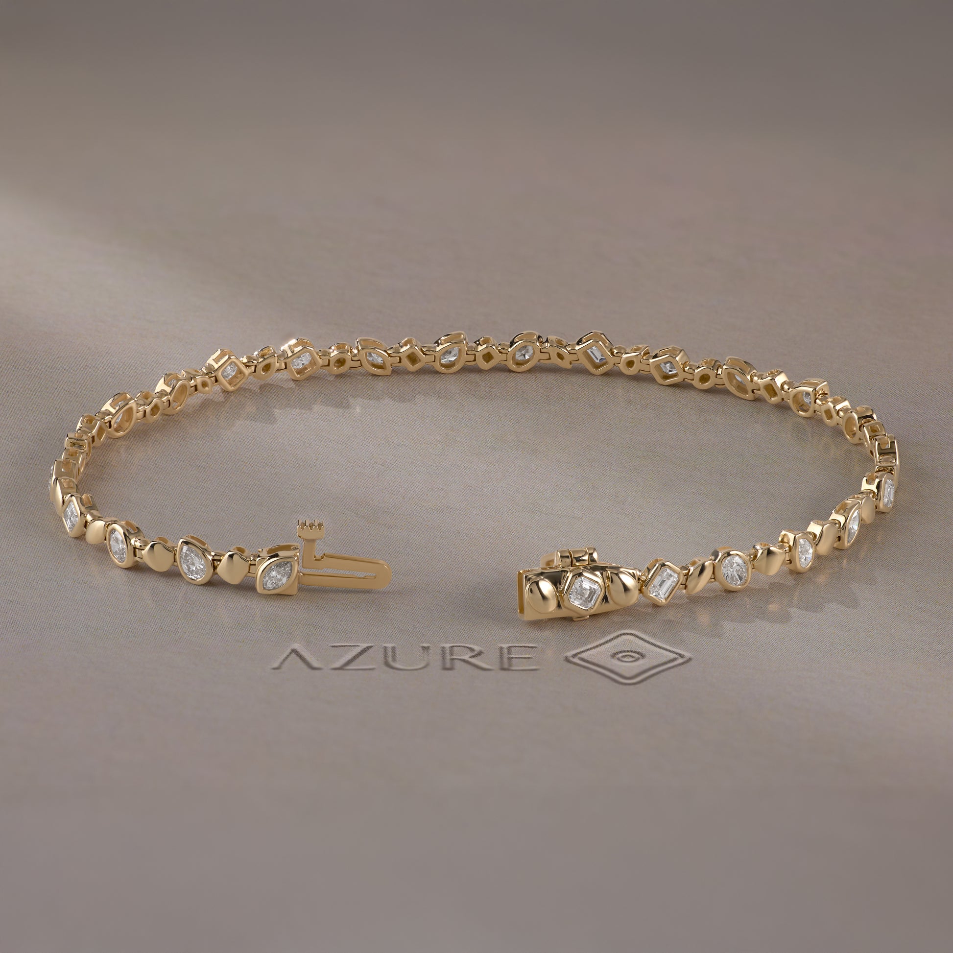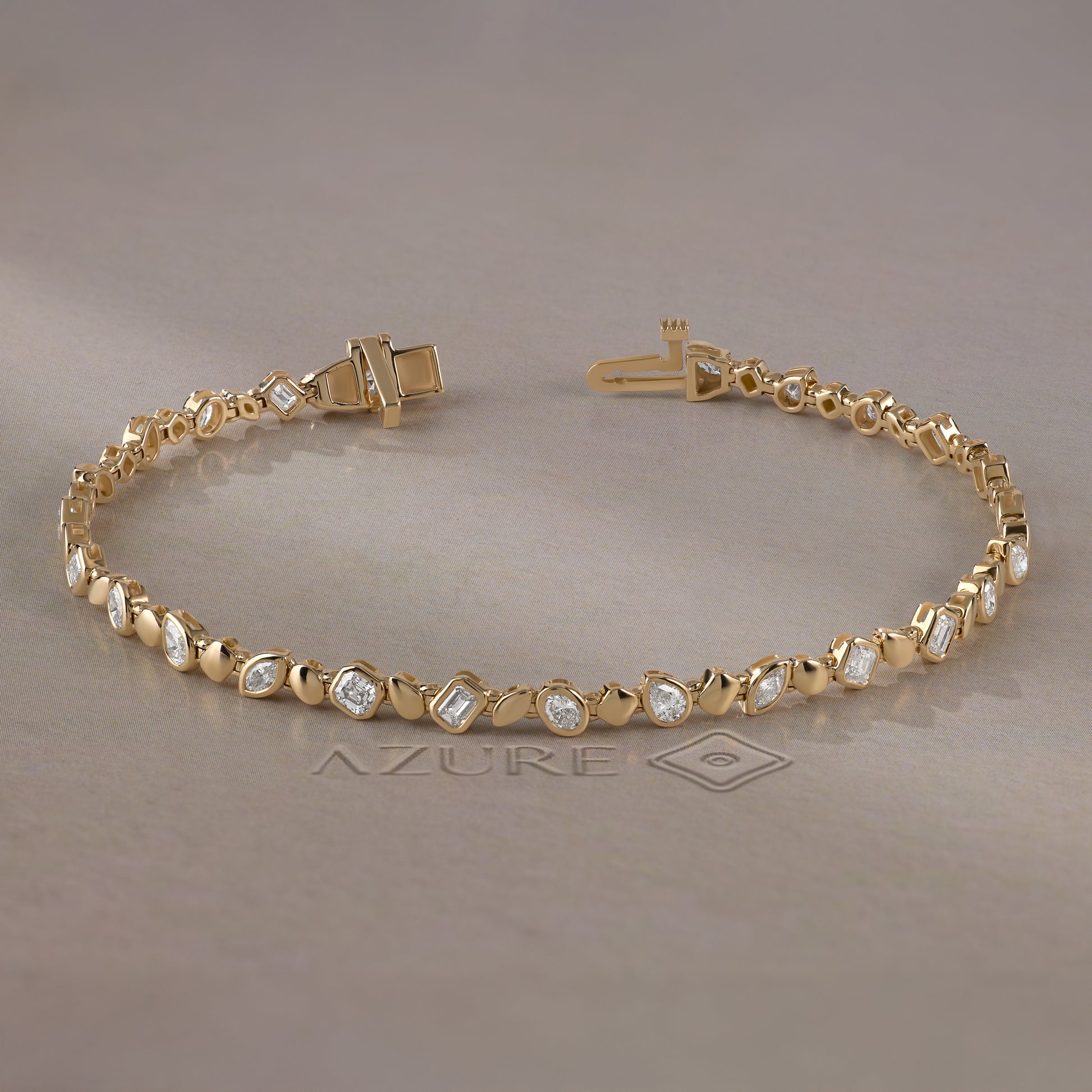Elevate your everyday elegance with this exquisite 14K yellow gold bracelet, featuring a harmonious blend of premium diamonds in Asscher, Pear, Emerald, Oval, and Marquise cuts. Each stone is meticulously set within an intricately linked gold design, creating a timeless pattern that seamlessly transitions from day to evening wear. This handcrafted piece embodies refined luxury and classic sophistication, making it the perfect addition to any fine jewelry collection. A versatile statement of enduring style and understated glamour.