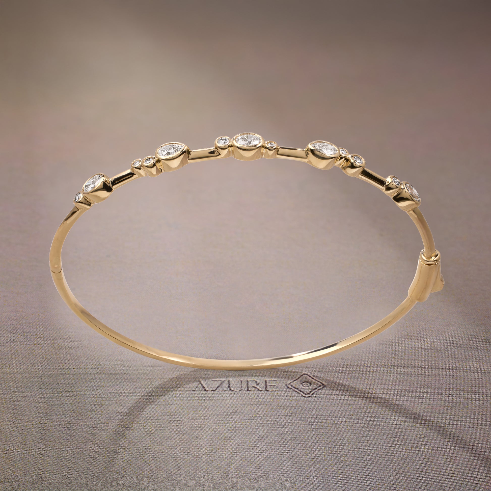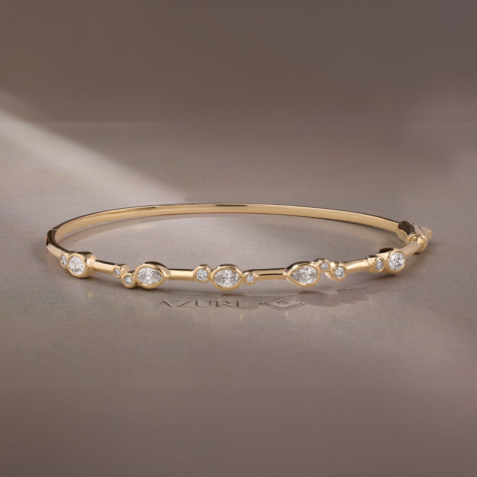 This 14k yellow gold bangle effortlessly balances subtlety and statement, making it a refined layering essential suitable from AM to PM. Featuring an elegant arrangement of oval, pear, and round-shaped stones, it casts a delicate, sophisticated glow that complements any ensemble. Perfect for adding a touch of understated luxury to your everyday look.