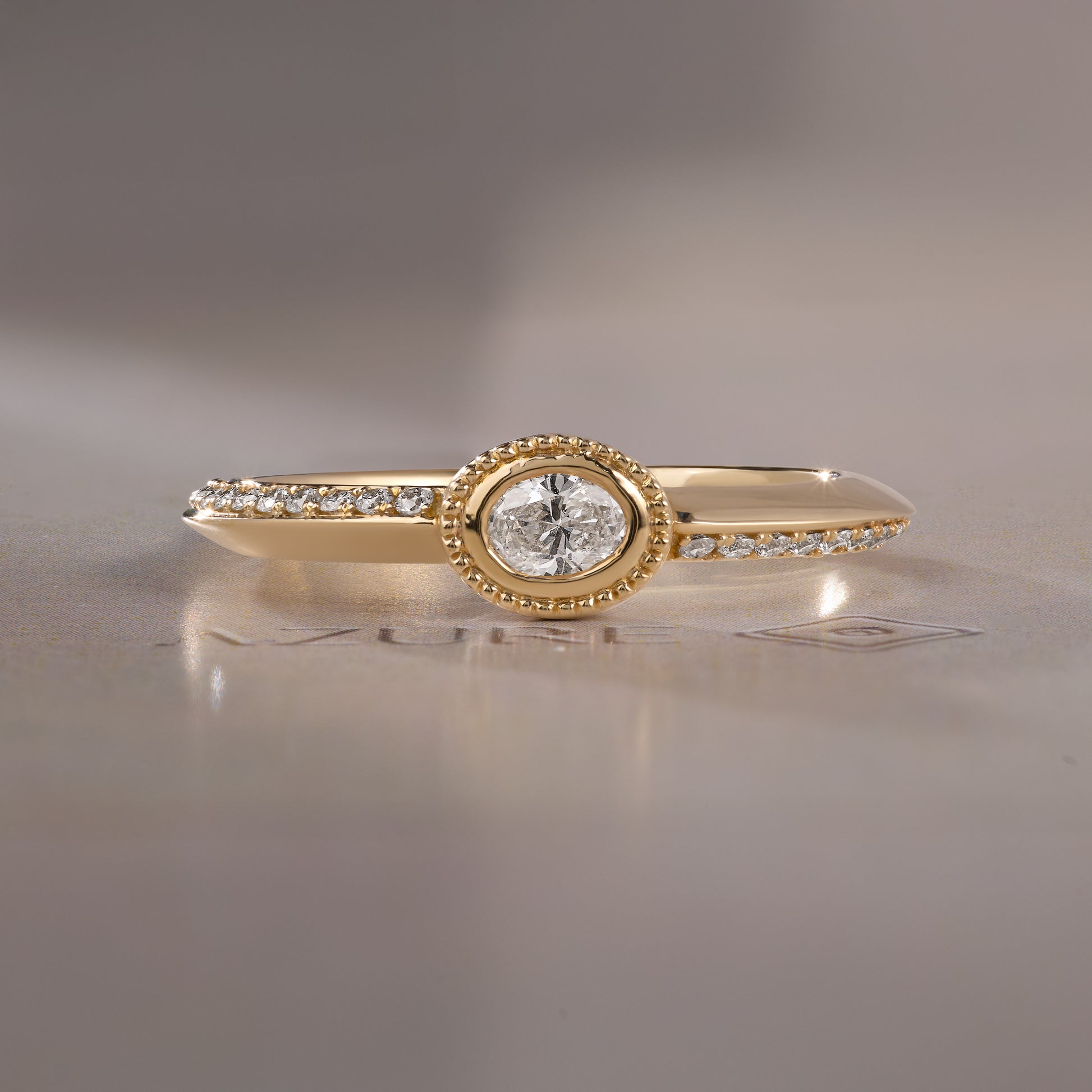 Discover timeless elegance with this exquisite 14K yellow gold ring, featuring a stunning oval diamond centerpiece framed by delicate round stones. The refined milgrain detailing adds vintage-inspired sophistication to this modern design. Handcrafted with meticulous attention to detail, this piece embodies luxury and grace, perfect for those who appreciate fine jewelry that transcends trends. A radiant symbol of enduring beauty and refined taste.