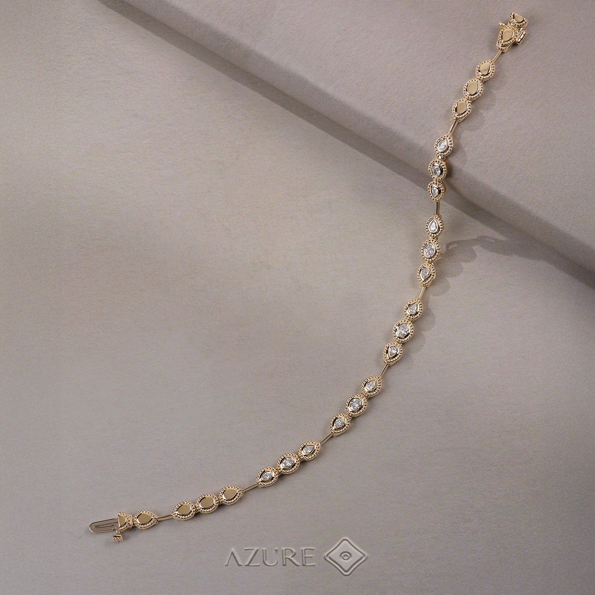Elevate your wrist with this exquisite 14K yellow gold bracelet, featuring a harmonious blend of pear and oval-cut diamonds set with meticulous milgrain detailing. Each piece is handcrafted to perfection, showcasing elegant diamond accents that capture light with refined brilliance. This timeless luxury bracelet embodies classic sophistication, offering the perfect balance of understated elegance and enduring beauty. A refined addition to any fine jewelry collection, it serves as a versatile companion for both everyday wear and special occasions.