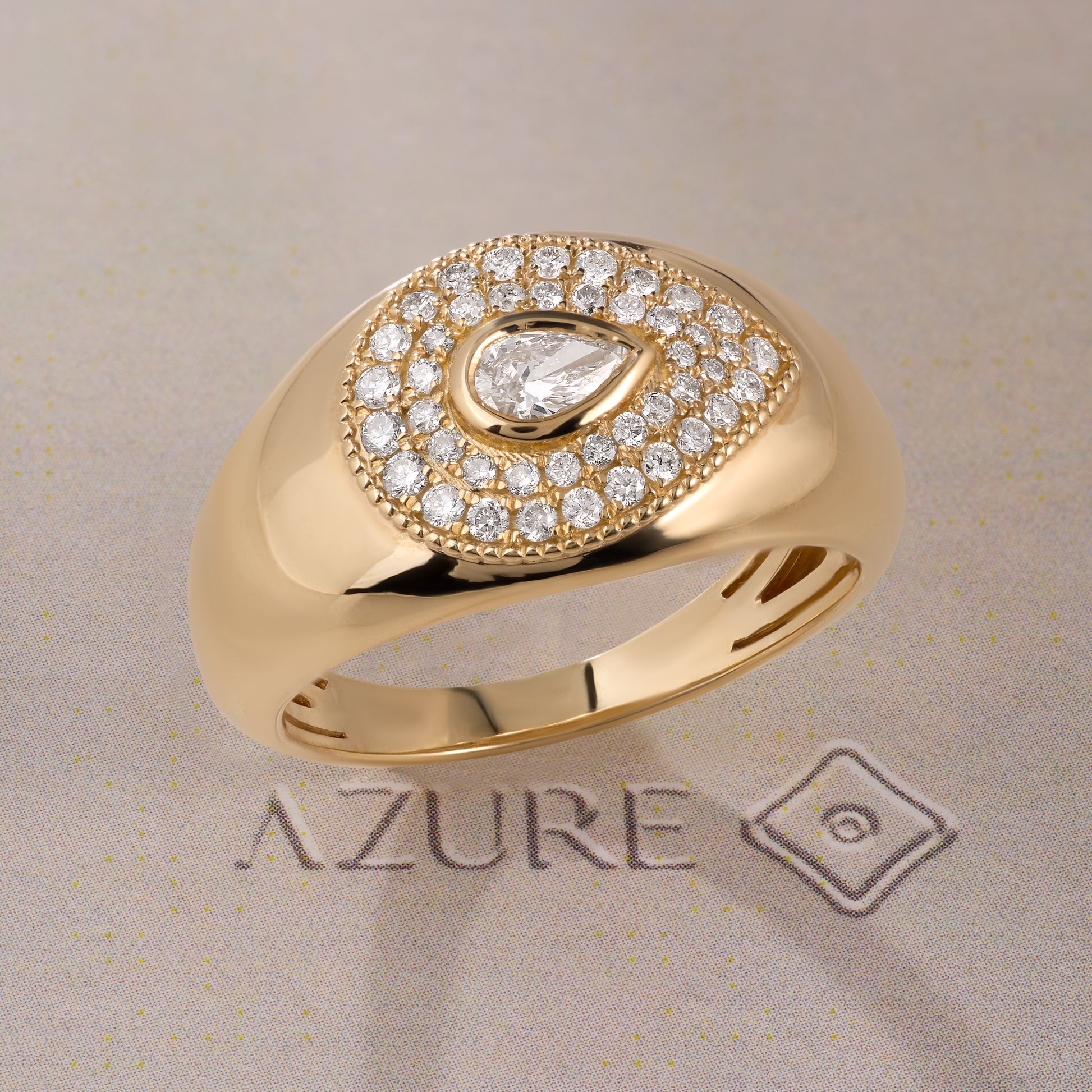 Elevate your elegance with this sophisticated dome ring, where timeless design meets contemporary craftsmanship. Featuring a stunning pear-shaped diamond at its center, surrounded by delicate round stones, this 14K yellow gold creation seamlessly blends vintage-inspired aesthetics with modern sensibility. The gracefully curved dome silhouette adds dimension and presence to your hand, while the classic proportions ensure enduring appeal. Perfect for those who appreciate refined jewelry that transcends fleeting trends, this piece becomes a cherished heirloom worthy of generations.