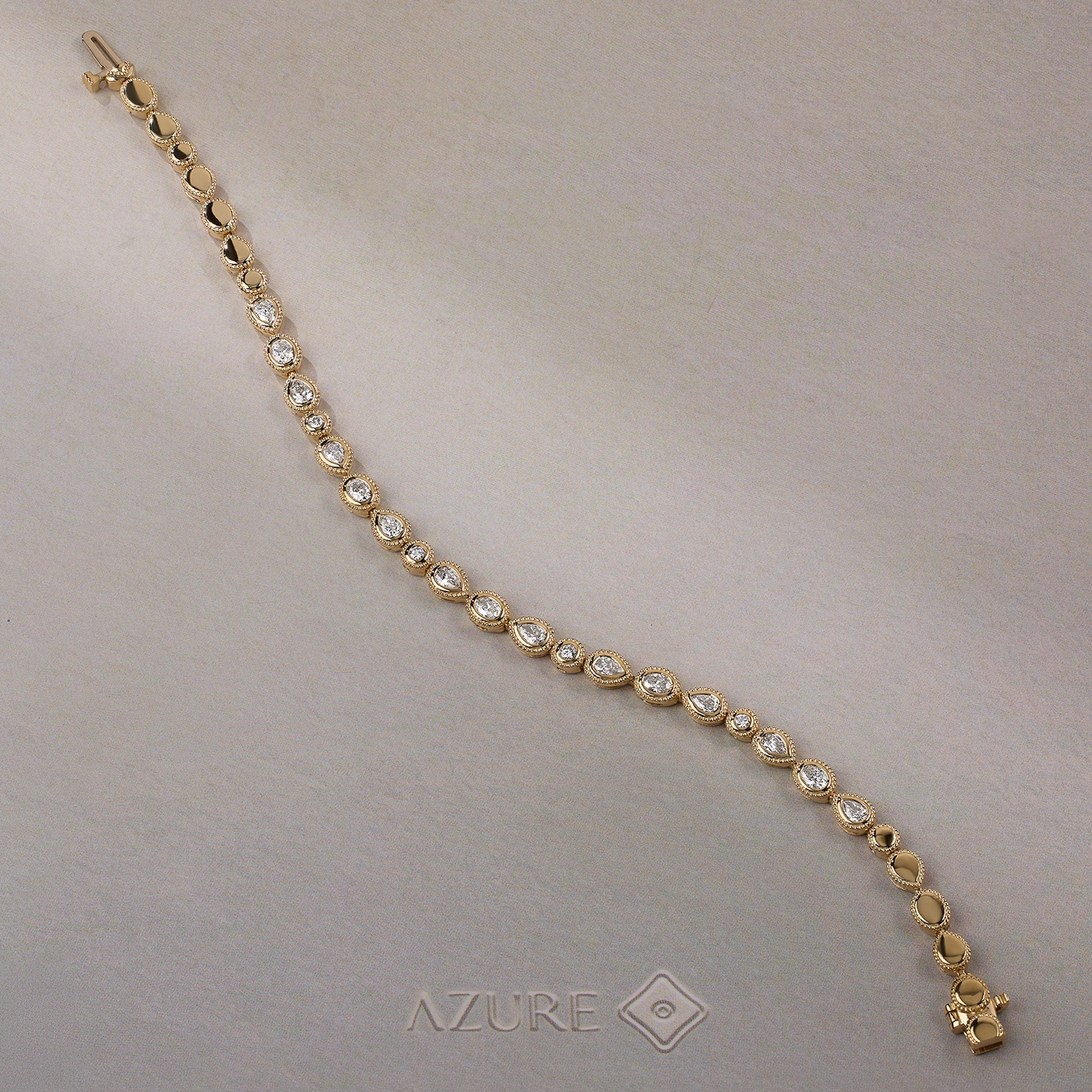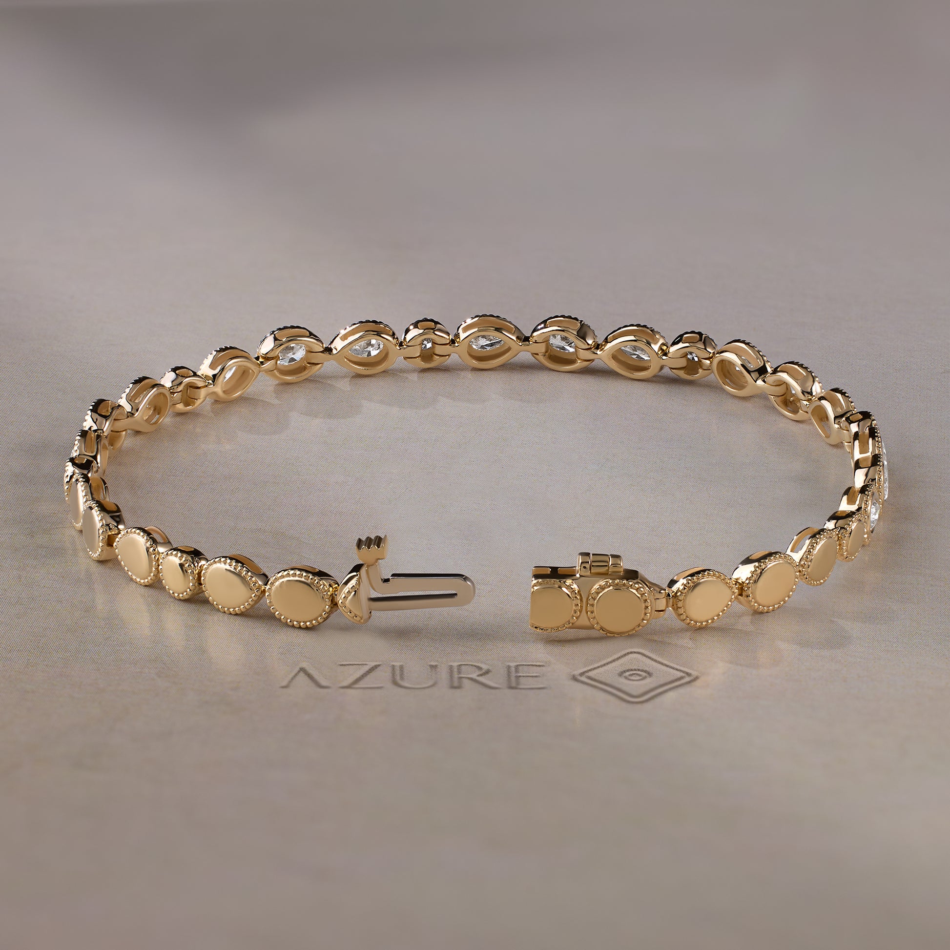 Elevate your wristwear with this exquisite 14K yellow gold bracelet, featuring a harmonious blend of round, pear, and oval diamonds set in refined bezel settings. Each link showcases meticulous craftsmanship, creating a timeless pattern that balances classic elegance with contemporary minimalism. This handcrafted luxury piece combines sophisticated design with understated beauty, making it the perfect statement accessory for those who appreciate fine jewelry with enduring appeal.