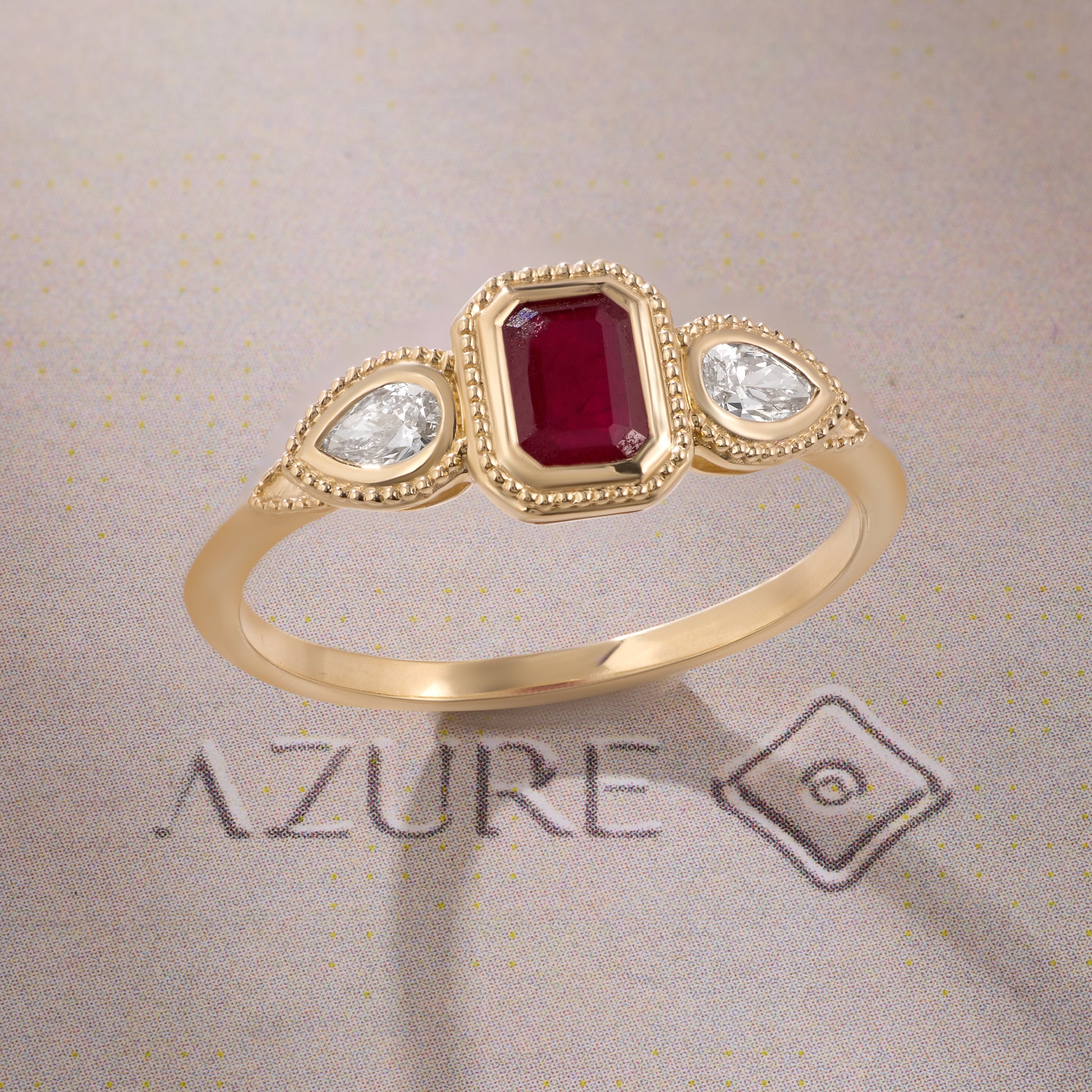 Discover timeless sophistication with this exquisite 14K yellow gold ring, featuring a radiant Emerald ruby centerpiece flanked by elegant pear-shaped diamonds. The delicate beaded milgrain border adds refined detail and vintage-inspired charm. Perfect for those who appreciate understated luxury, this piece seamlessly transitions from everyday wear to special occasions, embodying classic elegance with a contemporary sensibility.