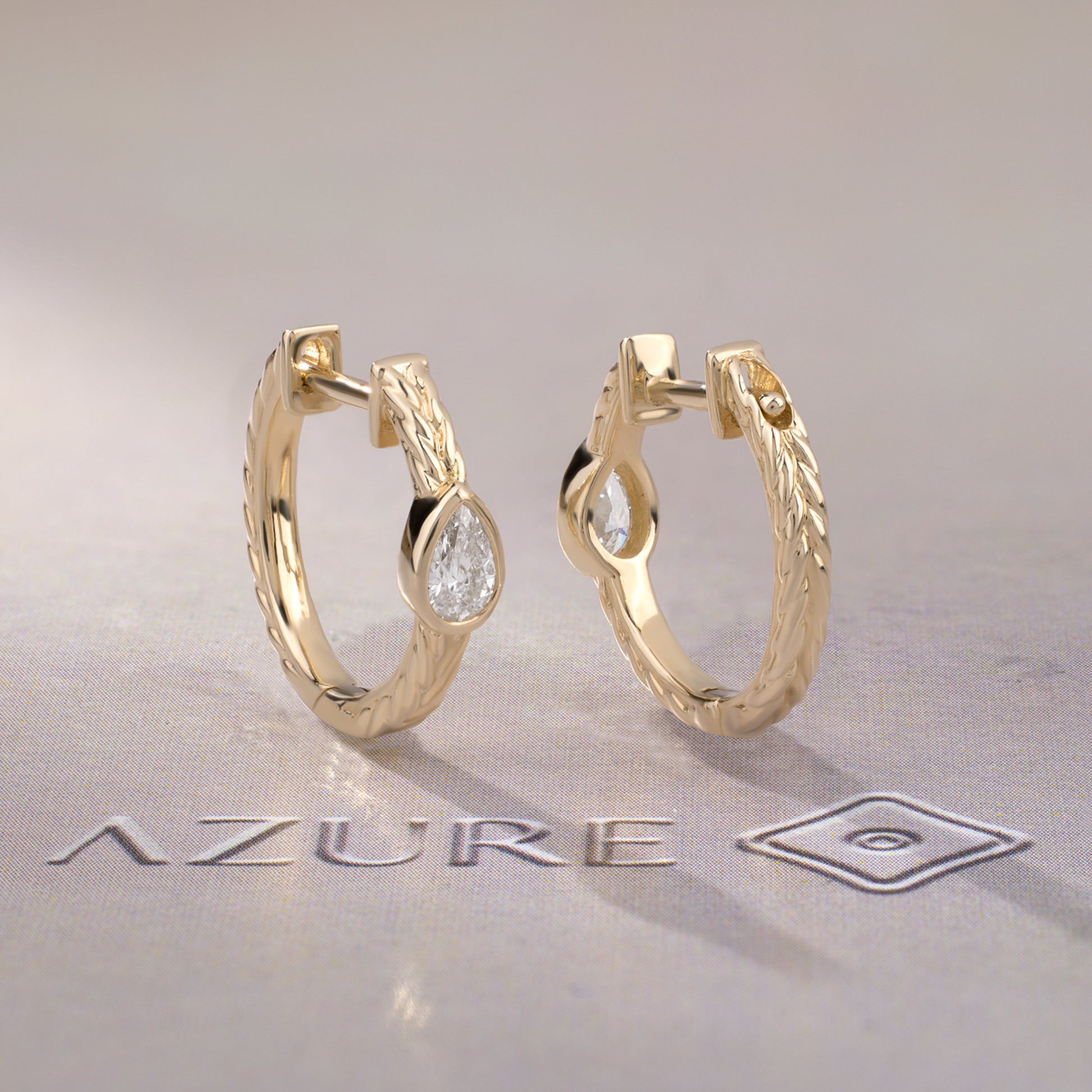 Indulge in everyday luxury with our 14K yellow gold hoop earrings featuring an Pear diamond center and braided gold texture. These sleek earrings offer refined detailing and timeless sophistication for AM-to-PM style. Add a touch of modern minimalism to your stackable fine jewelry collection.