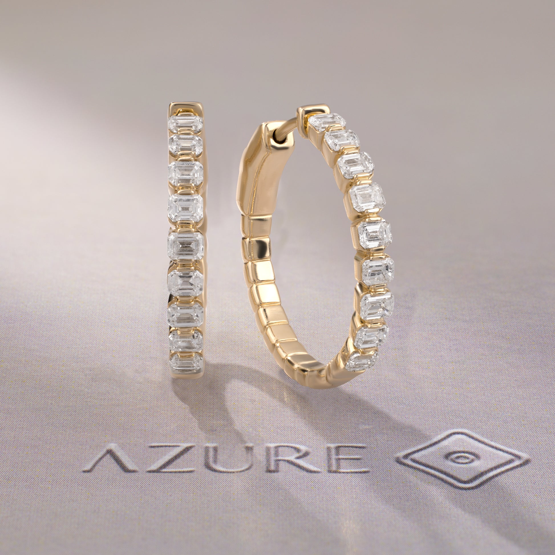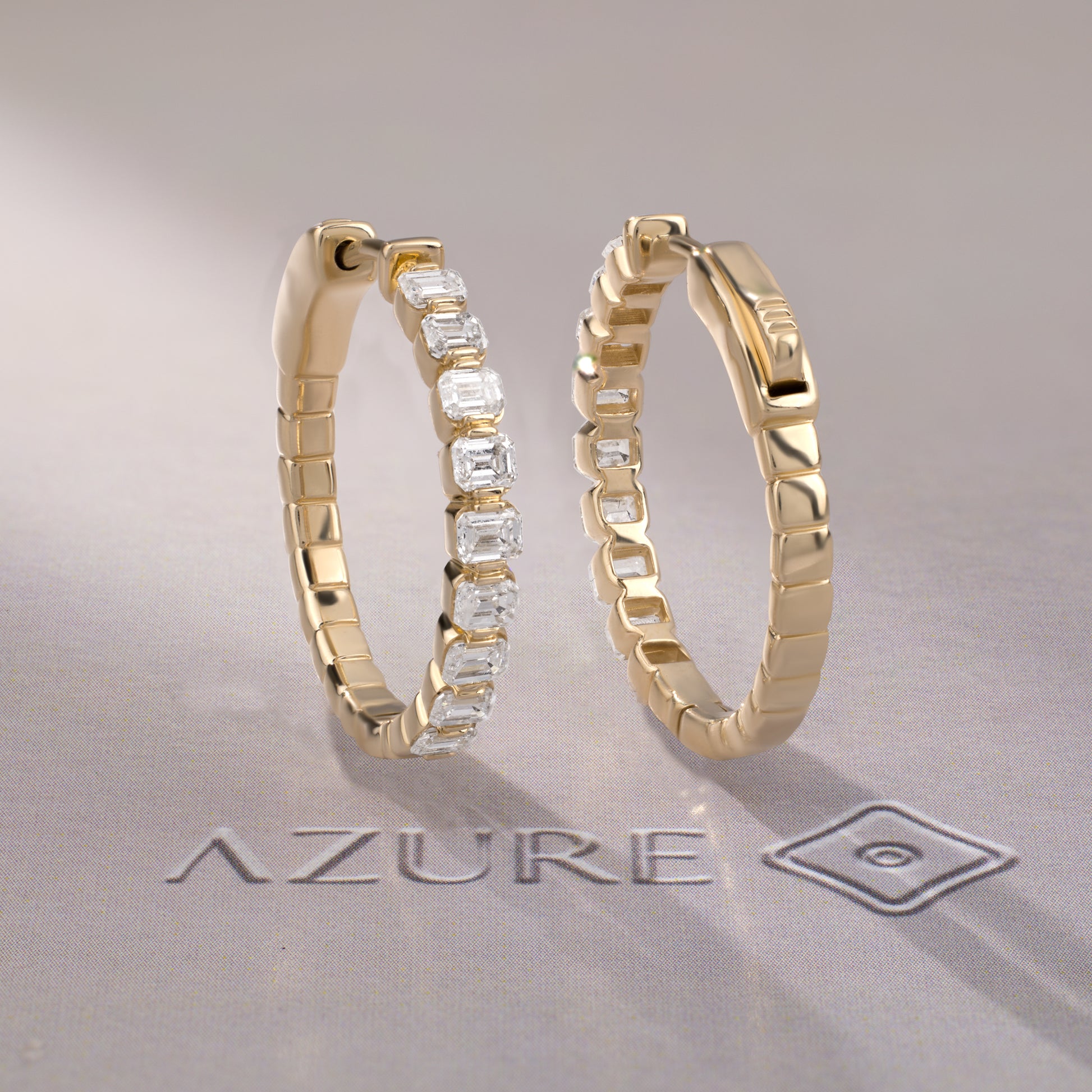 Elevate your everyday elegance with these refined 14K yellow gold hoop earrings, featuring stunning Emerald-cut diamonds that catch light from every angle. Crafted for those who appreciate understated luxury, these timeless hoops deliver subtle sparkle without compromise, effortlessly complementing any wardrobe while maintaining their enduring appeal.