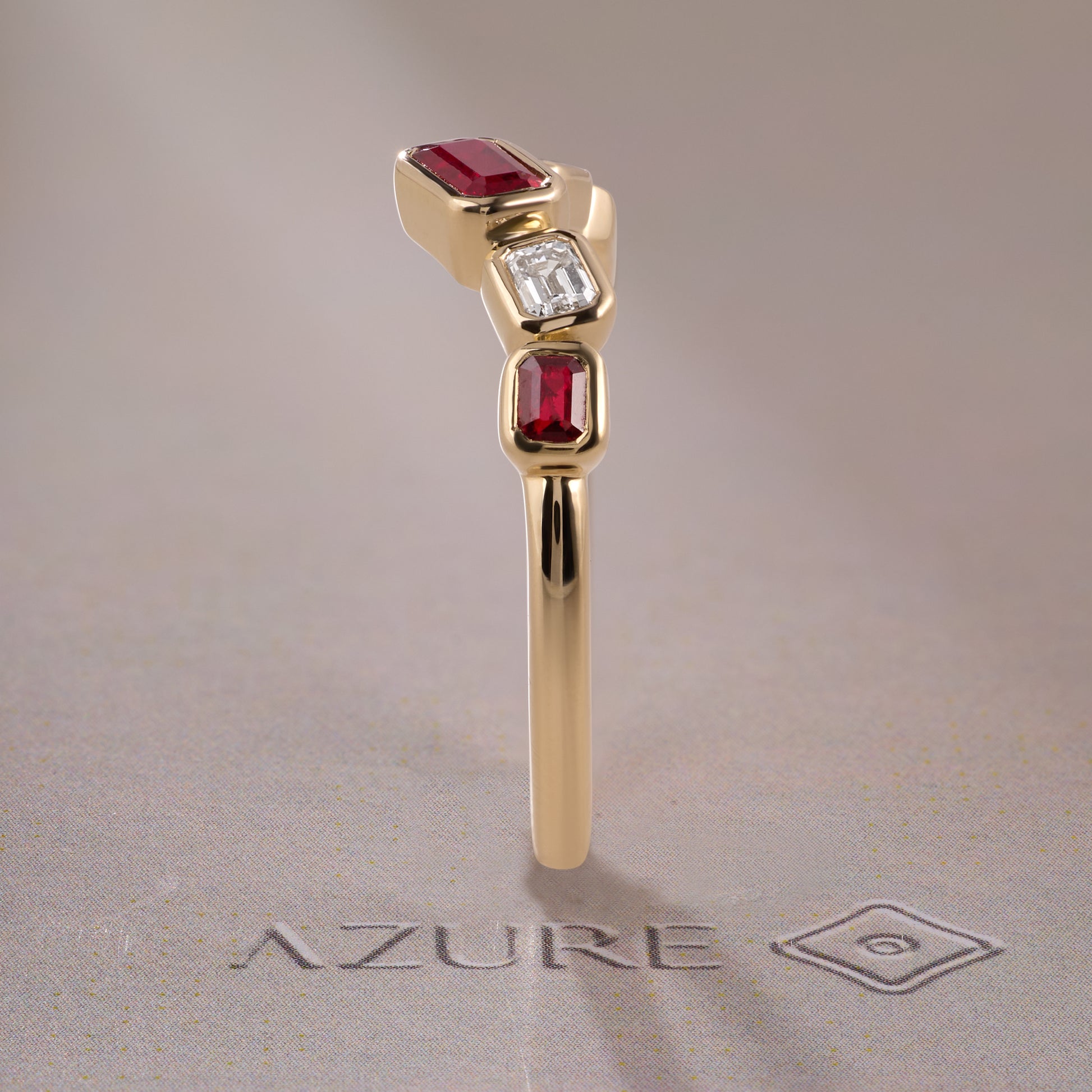 Elevate your everyday elegance with this exquisite 14K yellow gold ring, where timeless luxury meets contemporary design. The striking emerald-cut ruby and precisely faceted diamonds frame it with refined sparkle and bold contrast. This sophisticated piece balances modern geometry with classic opulence, making it an ideal statement ring for those who appreciate understated refinement and enduring beauty.