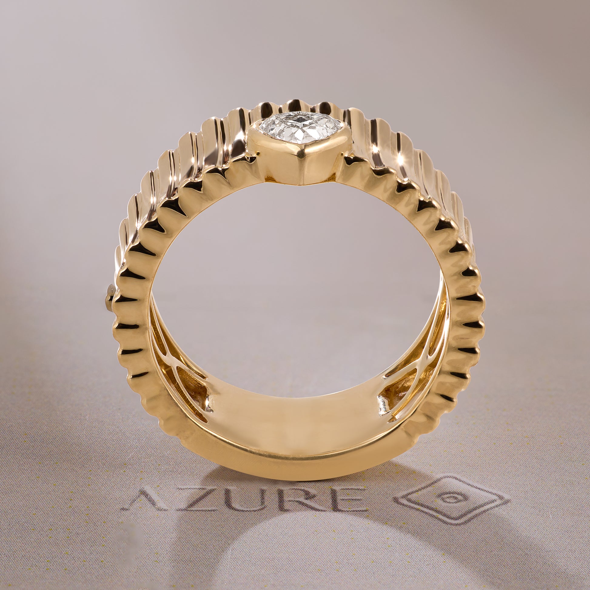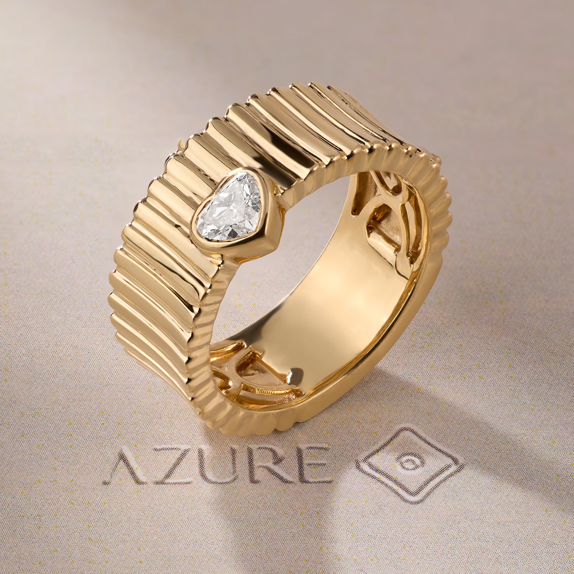 A striking statement ring that marries contemporary design with timeless elegance. Crafted in 14K yellow gold, this piece features a captivating heart diamond as its focal point, complemented by a distinctively ribbed band that adds bold texture and sculptural dimension. The refined ribbed detailing creates visual interest while maintaining a modern classic aesthetic, making it equally at home as an everyday luxury piece or a show-stopping special occasion ring. Perfect for those who appreciate refined craftsmanship and architectural beauty in their jewelry.