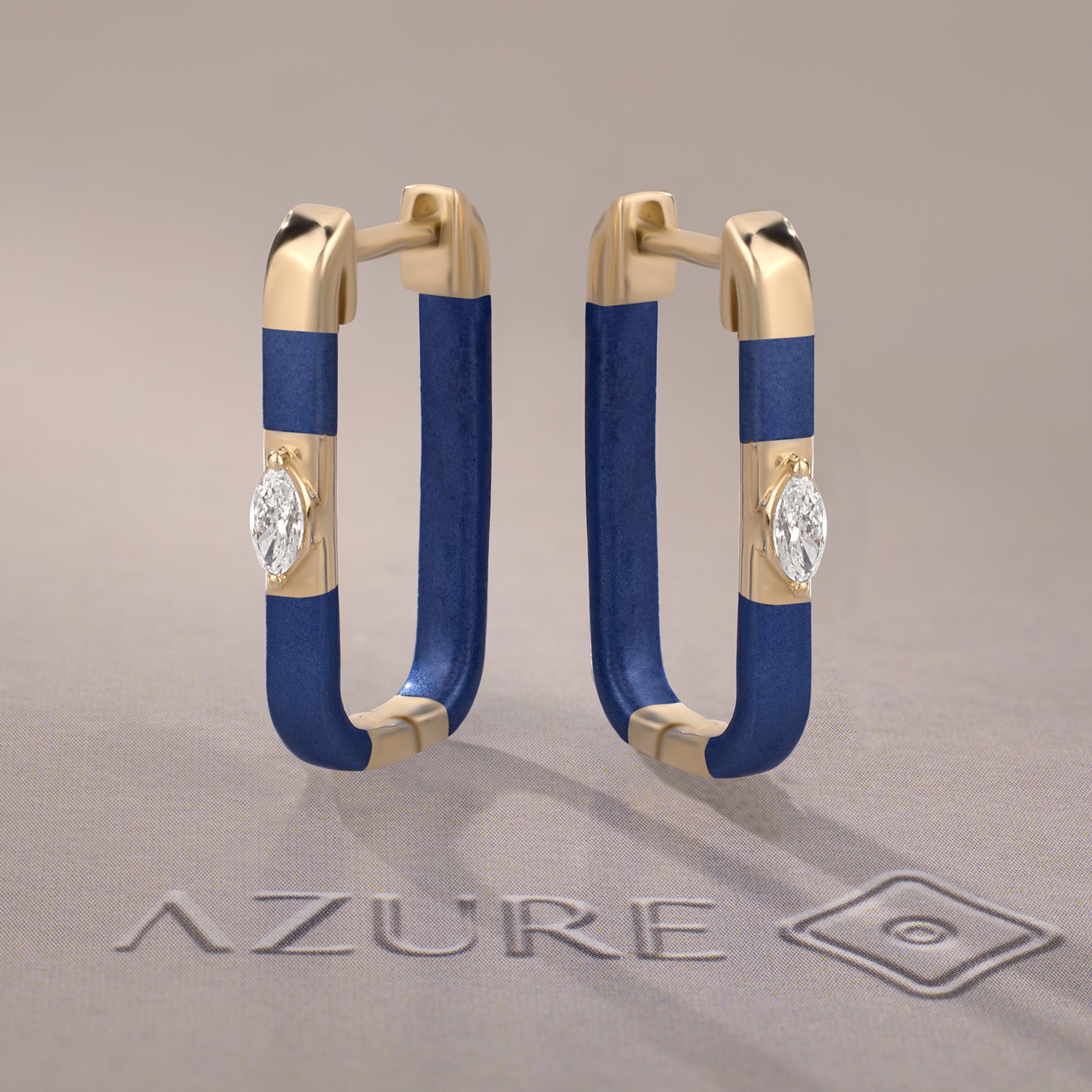 Elevate your everyday elegance with these refined 14K yellow gold hoop earrings, featuring vibrant Blue enamel detailing and a delicate Marquise shaped diamond accent.  The lustrous gold paired with the jewel-toned enamel creates a striking contrast, while the diamond accent adds a touch of timeless glamour. Perfect for those who appreciate contemporary design with classic appeal.