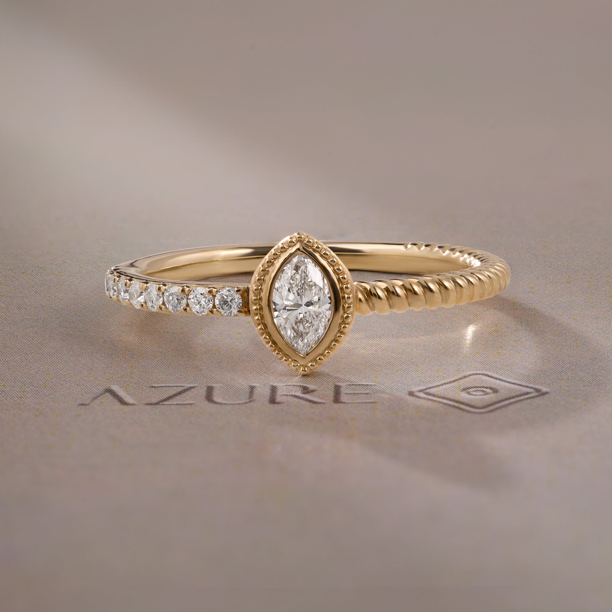 Discover refined elegance with this exquisite 14K yellow gold ring, featuring a stunning marquise diamond at its center complemented by a round diamond accent. Meticulously crafted to embody modern sophistication and timeless luxury, this delicate piece showcases the finest artistry and attention to detail. A symbol of enduring commitment, this ring seamlessly blends contemporary design with classic beauty, making it the perfect choice for those who appreciate understated glamour and exceptional craftsmanship.