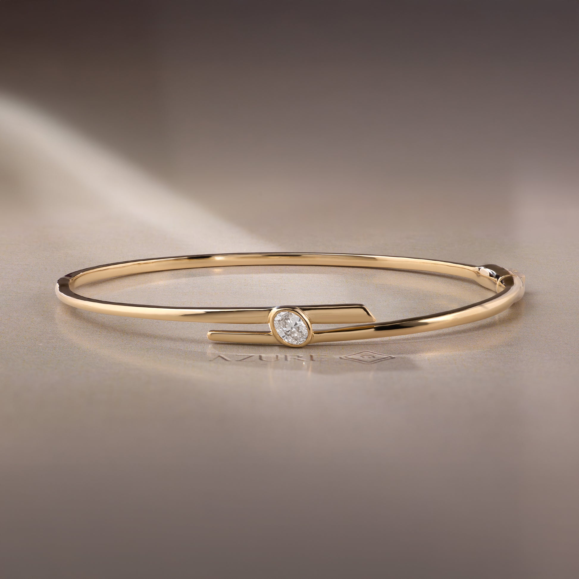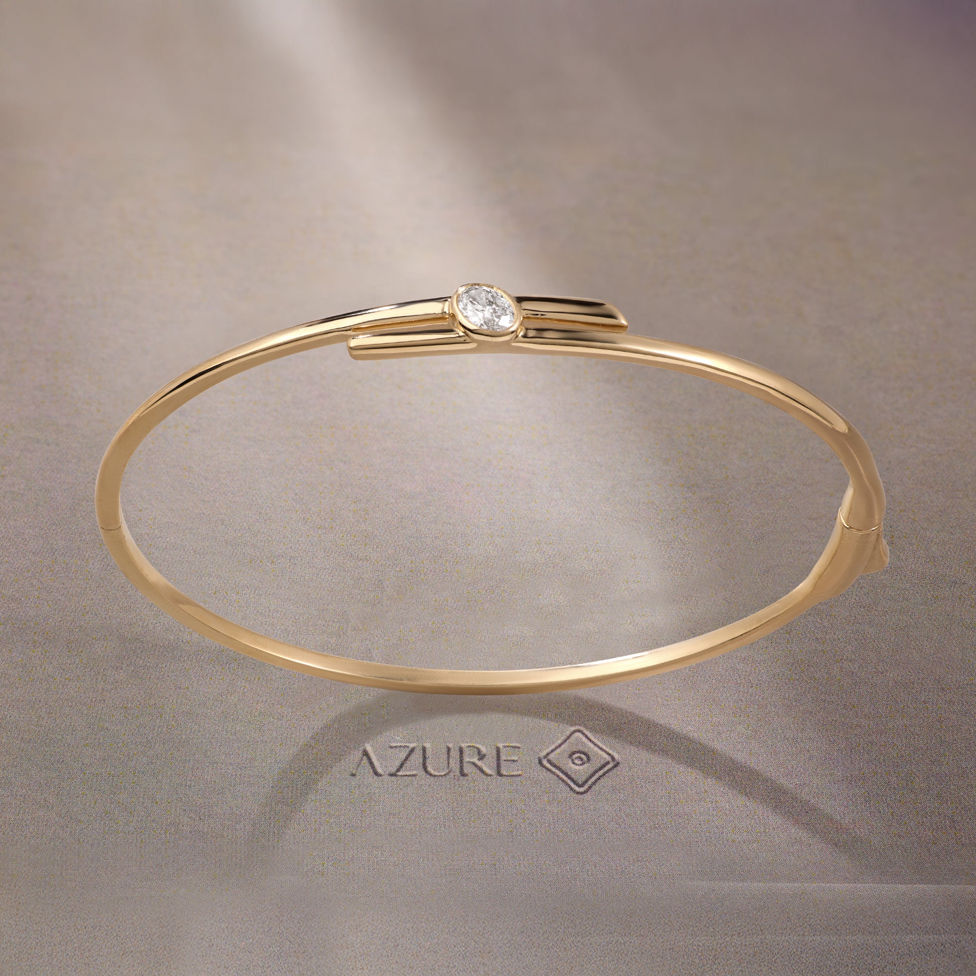 Crafted from 14k yellow gold, this bangle features a single Oval-shaped center stone that radiates an elegant sheen. Its classic, stackable design ensures comfort for all-day wear while adding a refined touch to any ensemble. Perfect for those who appreciate subtle sophistication.