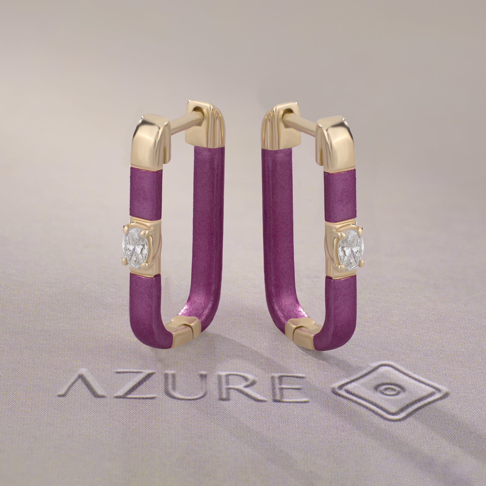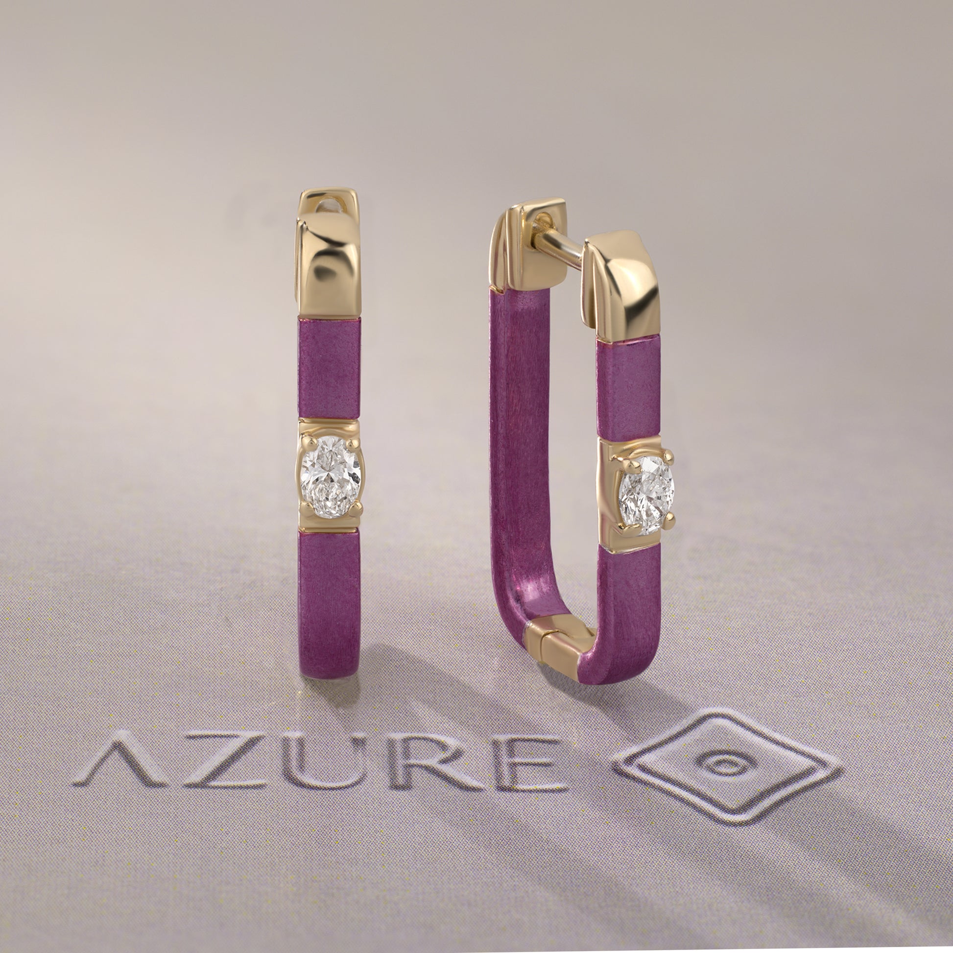 Elevate your everyday elegance with these refined 14K yellow gold hoop earrings, featuring vibrant Purple enamel detailing and a delicate Oval shaped diamond accent.  The lustrous gold paired with the jewel-toned enamel creates a striking contrast, while the diamond accent adds a touch of timeless glamour. Perfect for those who appreciate contemporary design with classic appeal.