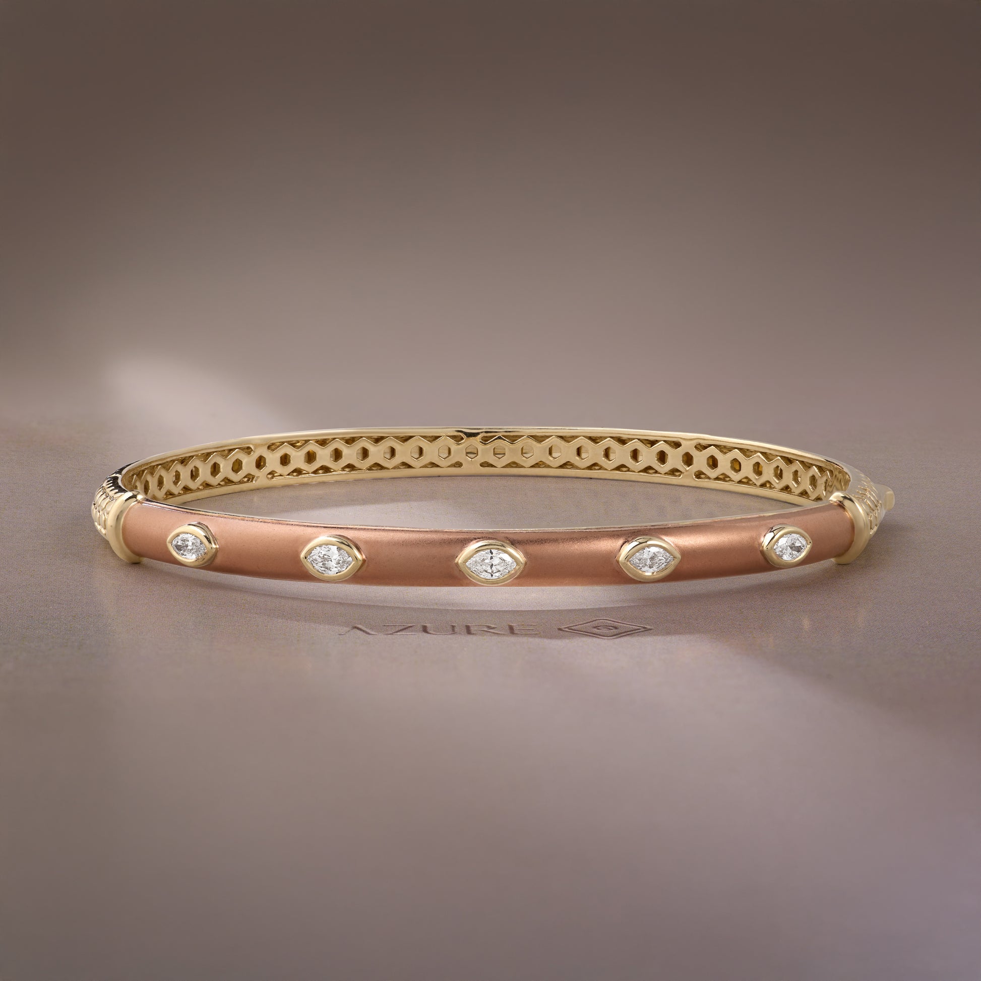 This exquisite 14k yellow gold bangle blends marquise shaped stones with delicate orange color enamel accents, creating a refined glow that elevates your style. Its classic yet chic design transitions effortlessly from day to night, adding a sophisticated touch to any ensemble. Perfect for those who appreciate understated elegance with a modern twist.